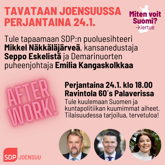 Miten voit Suomi kiertueella mukana SDP puoluesihteeri Mikkel Näkkäläjärvi, kansanedustaja Seppo Eskelinen ja Demarinuorten sekä JTY puheenjohtaja Emilia Kangaskolkka. Tervetuloa kuulemaan ja keskustelemaan valtakunnan ja kaupunkipolitiikan ajankohtaiset asiat.